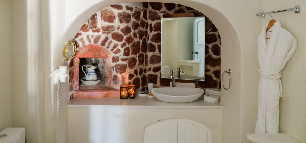 Each residence includes a comfortable bedroom with a queen-size bed, a marble-tiled bathroom with a walk-in shower, and a spacious living area furnished in a traditional, understated style. Naturally cool due to their position within the cliff, the cave houses maintain a pleasant temperature throughout the summer.