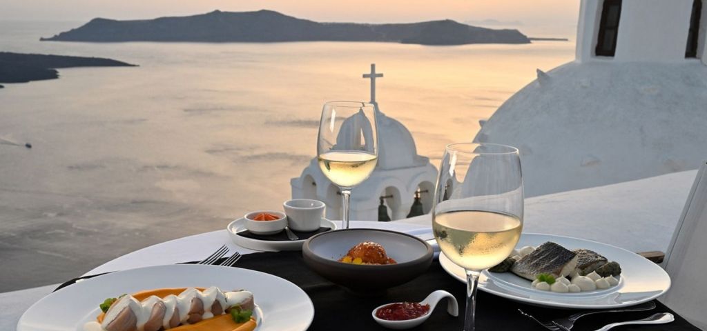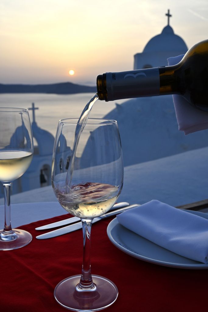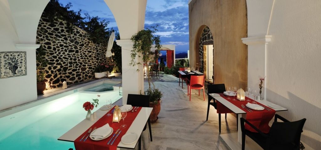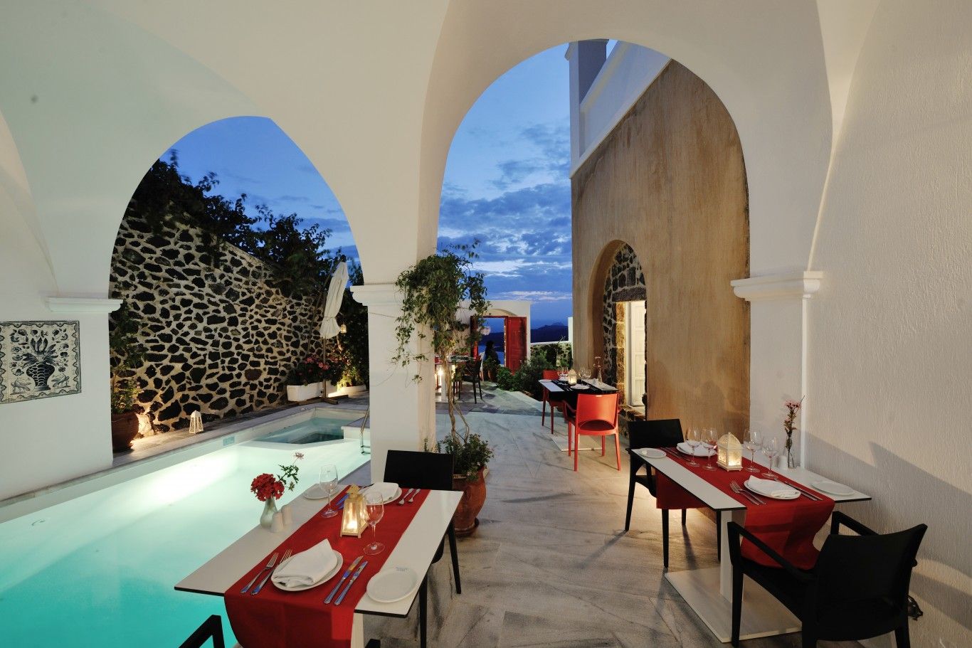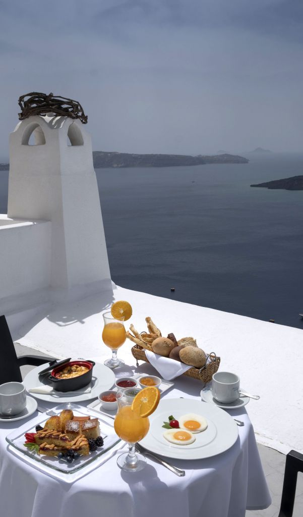 Room service is available throughout the day, allowing you to enjoy any meal with uninterrupted caldera views. Sunset is an especially unforgettable time; many guests choose to dine on their private balcony as the sky turns shades of gold and red.