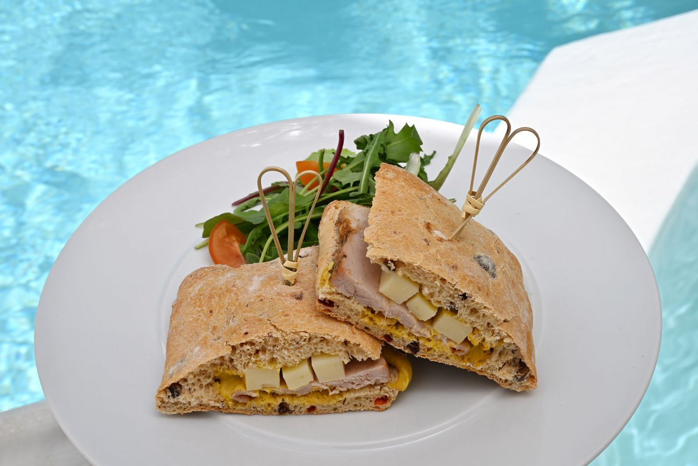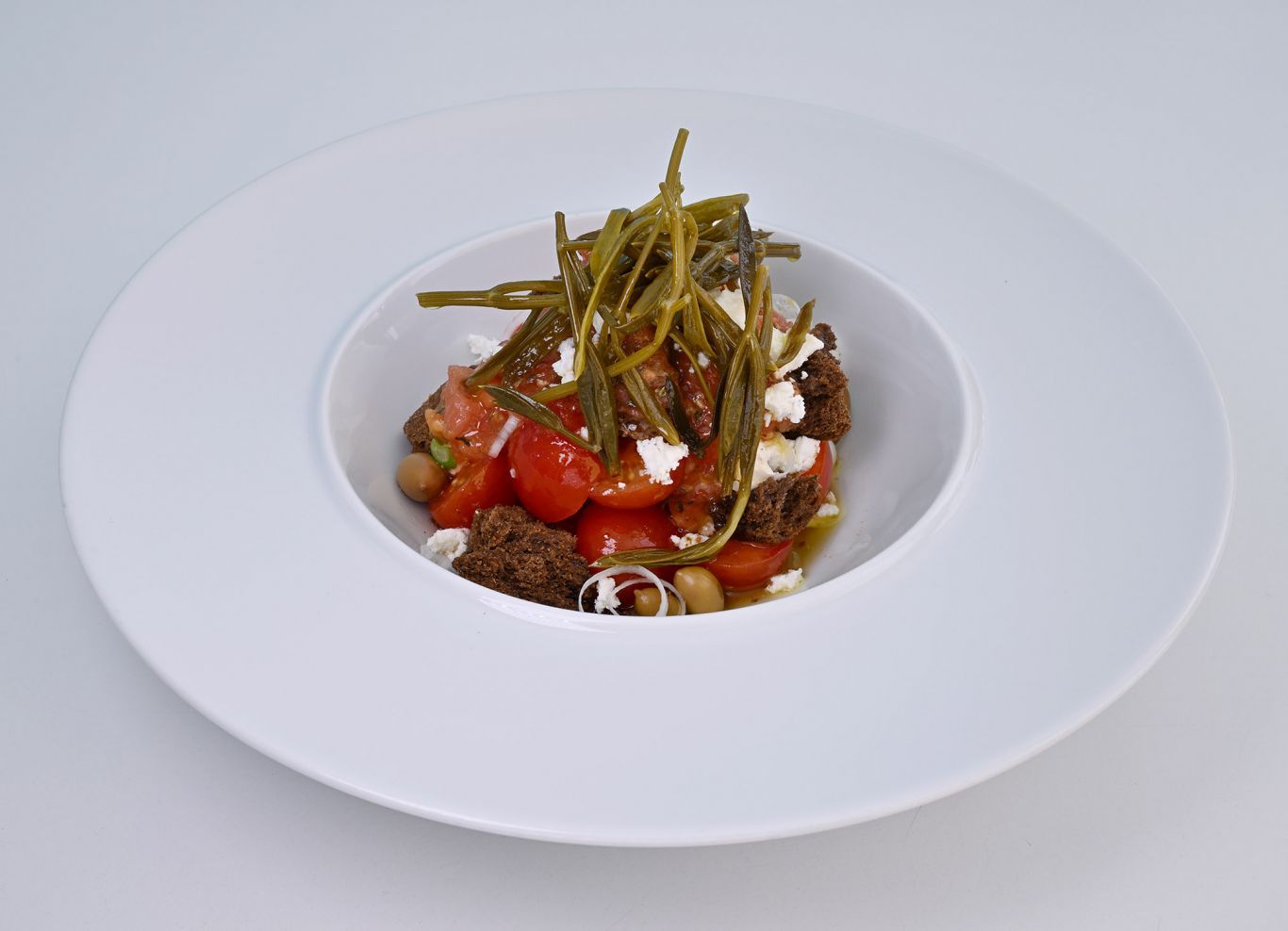 The menu features a selection of fresh salads, mezedes (Greek tapas), sumptuous sandwiches, traditional specialties, and desserts. Ingredients are thoughtfully chosen, with an emphasis on freshness, quality, and local products—from Santorinian tomatoes and capers to cheeses from Santorini and Crete.